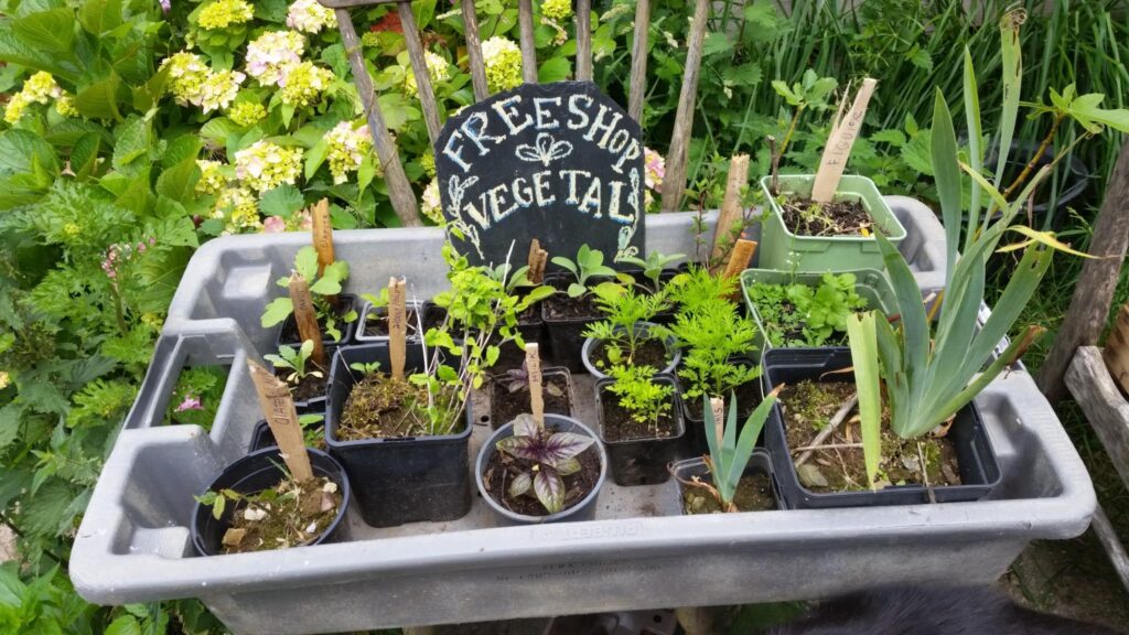 Et sinon, je fais pas mal du jardin, plutot des aromatiques et plantes médicinales. Je prends des botures ou petites bébés des que je vois une plante qui n’est pas encore courant chez moi et qui je trouve sympa. Dans des jardins botaniques, chez des amix ou juste n’importe où, y en a partout des plantes! Et puis la j’habite un endoit qui est particulièrement adapté pour faire des boutures, le climat doux et humide et j’ai de la place dehors et dans une serre. Et du coup je me suis mis à en faire plus de ce que j’ai besoin. J’ai installé un free-shop végétal ou les gen.tes qui nous rendent visite peuvent se servir à prix libre. Et je le ramène sur des evenements adaptées. J’ai fait des fiches expliquatives pour tout les espèces proposées qui sont des fois des plantes peu connues mais déliceuses ou alors des remèdes puissants.