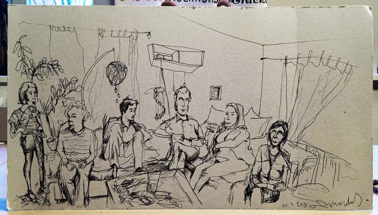 Großgruppen zu malen macht besonders viel Spaß, weil da oft eine richtige Dynamik entsteht, wenn die Leute sehen wie ihre Freunde gezeichnet werden. Am SupermART 2015 habe ich eine 9-köpfige Gruppe 5 mal portraitiert. Dieses Mammutprojekt war sehr lustig, was wir gelacht haben beim malen!