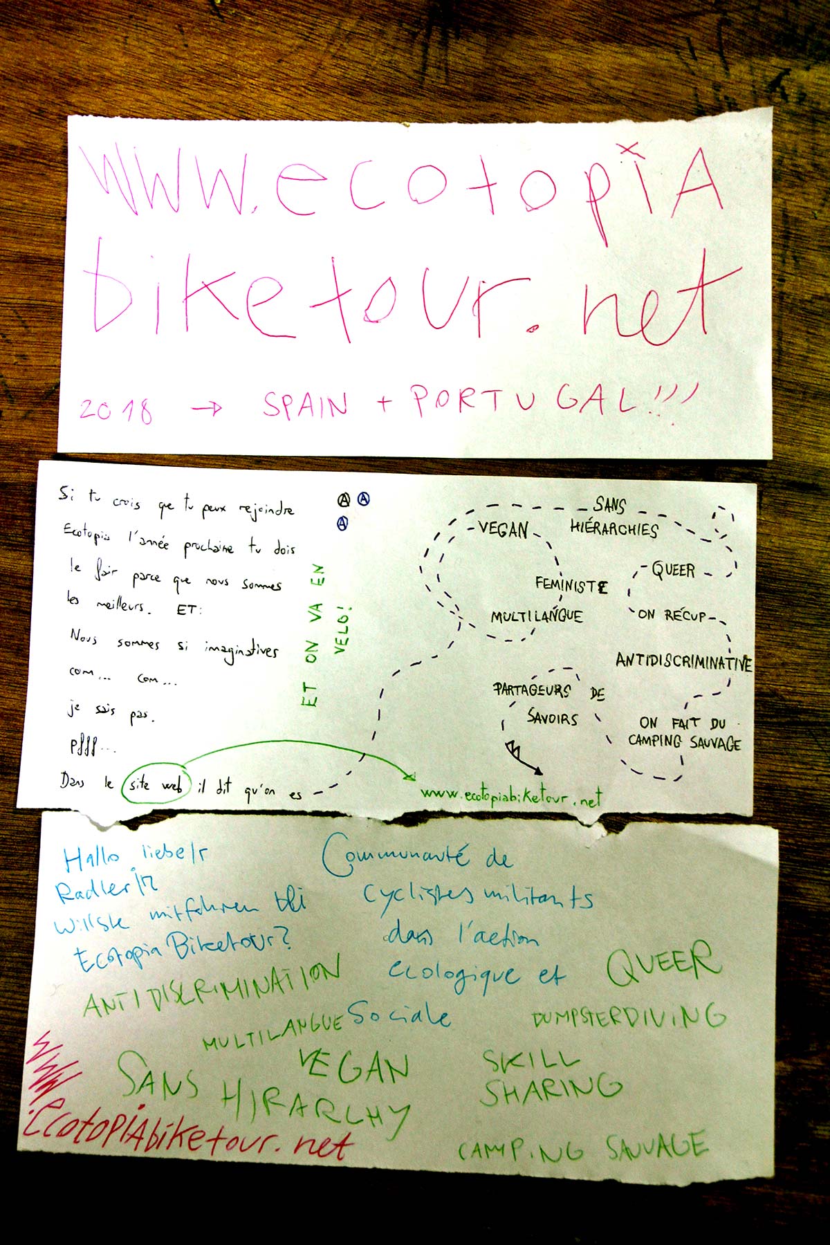 Tout les ans je fais un Poster pour le Biketour. Cette fois un drole d’accident m’a aidé: Pendant la réunion d’hiver nous avons imprimé des flyers. L’imprimante était pas capable de imprimer recto-verso. Du coup l a fallu que nous, on dessine quelques trucs et ecrit des textes à la place. C’était le fun et moi, j’ai tout de suite pris en photo les resultats et les a utilisé pour le poster.